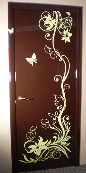 Этот метод зачастую применяется для декора дверей со стеклянными вставками. Пескоструйный метод оформления отличается сложностью изготовления, поэтому приравнивается к истинному искусству. Так как узоры будут наноситься соответствующей машинкой, с данным процессом невозможно справиться самостоятельно, если нет навыков.