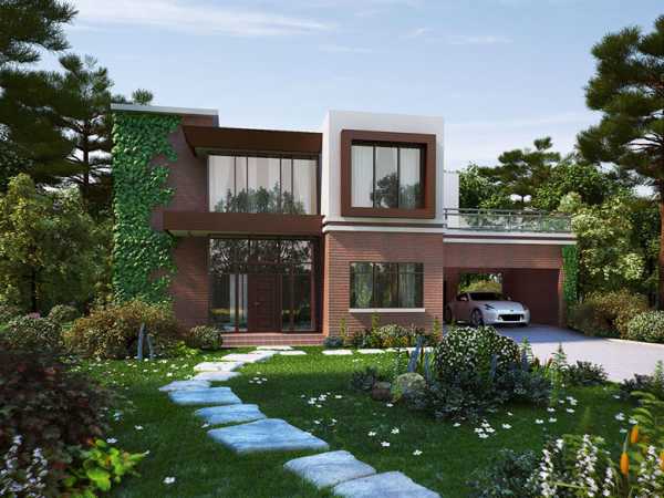 Фасады коттеджей в современном стиле могут быть выполнены из натуральных материалов и их аналогов. Самые красивые и воздушные проекты — из бетона и стекла, кирпич смотрится основательно и представительно, дерево предполагает полное единение с окружающей природой.