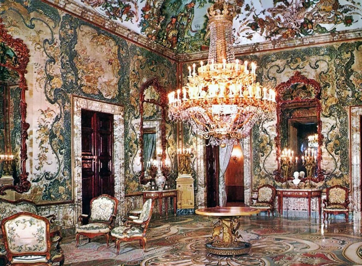 Неотъемлемая часть интерьера – мебель: резные нарядные столики-консоли на двух ножках, инкрустированные комодики и секретеры,