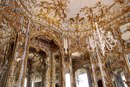 Легкие настенные панели с золочеными бордюрами, зеркала, золоченая лепнина плафона, гирлянды золотых цветов, изгибающиеся на белой поверхности стен, создают ощущение праздничности, роскоши, воздушной легкости.