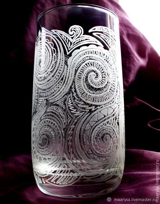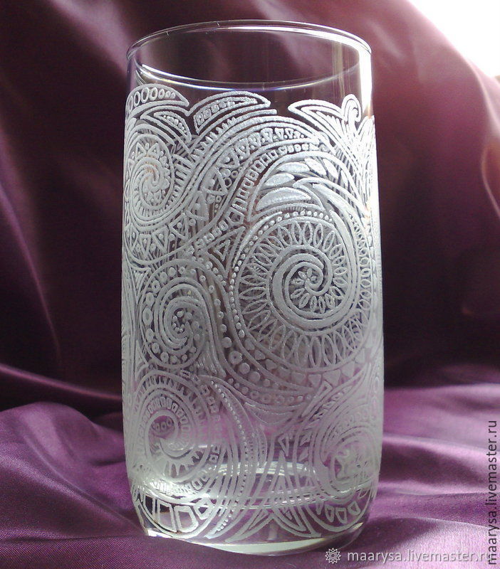 Если форма стеклянного предмета достаточно сложная (например, бокал или кувшин), и закрепить ровно шаблон не получается, Вы можете сделать разметку будущего рисунка графическими тонкими линиями на наружной стороне предмета при помощи обычного тонкого маркера.