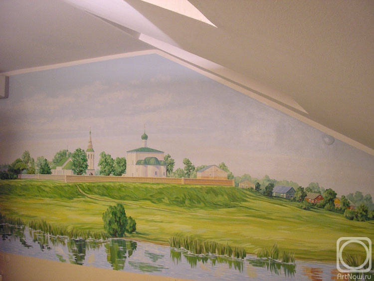 Π§ΡΠ΅Π·Π²ΡΡΠ°ΠΉΠ½Π°Ρ Π½Π°ΡΡΡΠ΅Π½Π½ΠΎΡΡΡ Π΄Π΅ΡΠ°Π»ΡΠΌΠΈ Π·Π°ΡΡΠ°Π²Π»ΡΠ΅Ρ Π·ΡΠΈΡΠ΅Π»Ρ Π²Π½ΠΈΠΌΠ°ΡΠ΅Π»ΡΠ½ΠΎ ΡΠ°ΡΡΠΌΠ°ΡΡΠΈΠ²Π°ΡΡ ΠΊΠ°ΠΆΠ΄ΡΠΉ ΠΊΡΡΠΎΠΊ ΡΠΎΡΠΏΠΈΡΠΈ. Π ΡΡΠΎΠΌ Π·Π°Π»Π΅ ΠΏΡΠ΅Π΄ΠΏΠΎΠ»Π°Π³Π°Π»ΠΎΡΡ ΡΡΡΡΠΎΠΈΡΡ Π²ΡΡΡΠ°Π²ΠΊΡ ΠΏΡΠΎΠΈΠ·Π²Π΅Π΄Π΅Π½ΠΈΠΉ ΠΈΠ· ΠΏΡΠΈΡΠΎΠ΄Π½ΠΎΠ³ΠΎ ΠΊΠ°ΠΌΠ½Ρ ΠΈ ΠΎΠ±ΡΠ°Π·ΡΠΎΠ² ΠΊΠ°ΠΌΠ΅Π½Π½ΠΎΠΉ ΠΎΡΠ΄Π΅Π»ΠΊΠΈ. ΠΠΎΠΌΠΏΠΎΠ·ΠΈΡΠΈΡ ΡΠ°Π±ΠΎΡΡ ΠΈΠ½ΡΠ΅ΡΠ΅ΡΠ½Π° Π½Π΅ΡΡΠ°Π½Π΄Π°ΡΡΠ½ΡΠΌ ΡΠ΅ΡΠ΅Π½ΠΈΠ΅ΠΌ, Ρ. ΠΊ. ΡΠ°ΠΌΠ° ΡΡΠ΅Π½Π° ΡΡΠ°Π»Π° ΡΡΠ°ΡΡΠ²ΠΎΠ²Π°ΡΡ Π² ΠΈΠ·ΠΎΠ±ΡΠ°ΠΆΠ΅Π½ΠΈΠΈ: Π½ΠΈΡΠ° Π² Π½Π΅ΠΉ Π²ΡΠΏΠΎΠ»Π½Π΅Π½Π° Π² ΡΠ΅Π°Π»ΠΈΡΡΠΈΡΠ΅ΡΠΊΠΎΠΉ ΠΌΠ°Π½Π΅ΡΠ΅ ΠΈ ΠΈΠ·ΠΎΠ±ΡΠ°ΠΆΠ°Π΅Ρ ΠΎΡΠ²Π΅ΡΠ΅Π½Π½ΡΡ ΡΠΎΠ»Π½ΡΠ΅ΠΌ ΡΠ΅ΡΡΠ°ΡΡ ΠΈ ΠΏΠ΅ΠΉΠ·Π°ΠΆ Π·Π°Π΄Π½Π΅Π³ΠΎ ΠΏΠ»Π°Π½Π°, ΠΎΠ±ΡΠ°ΠΌΠ»Π΅Π½ΠΈΠ΅ ΠΏΠ΅ΠΉΠ·Π°ΠΆΠ° Π²ΡΠΏΠΎΠ»Π½Π΅Π½ΠΎ Π΄Π΅ΠΊΠΎΡΠ°ΡΠΈΠ²Π½ΠΎ, Π½ΠΎ Ρβ¦