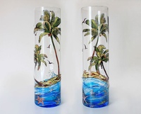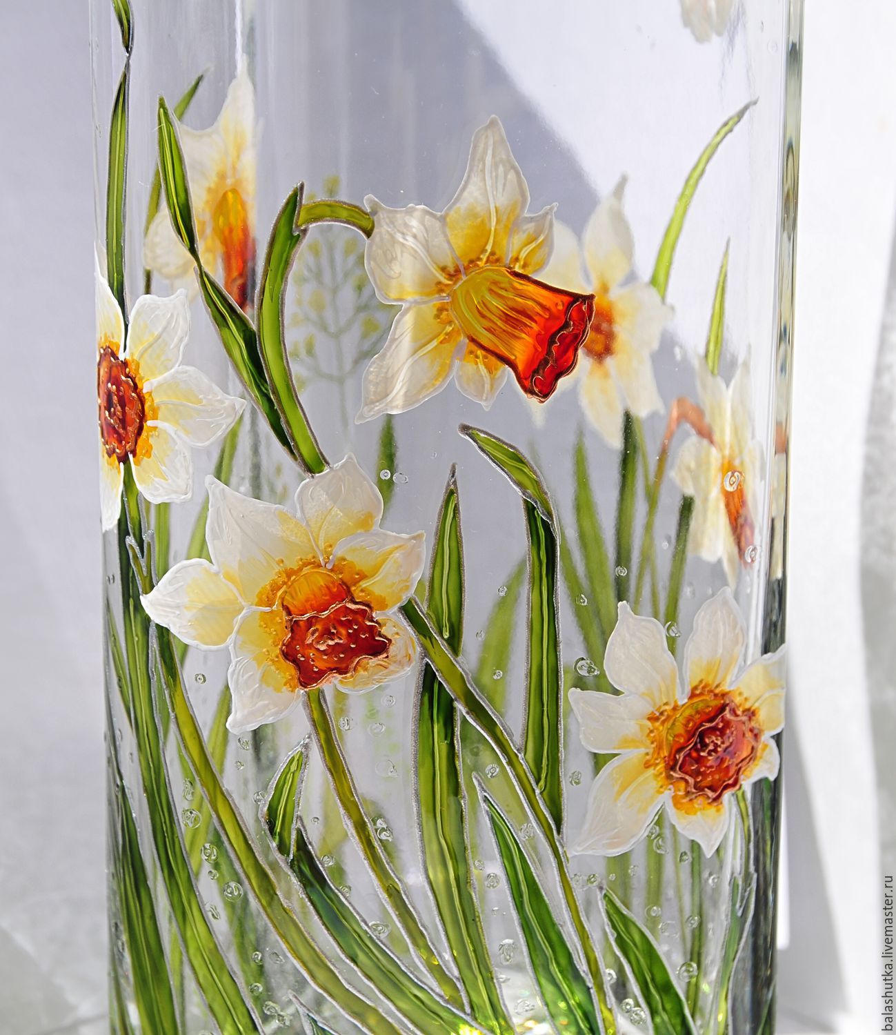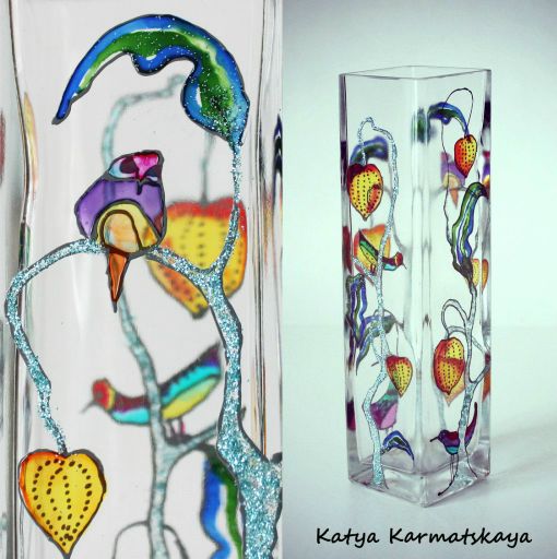 Приклеивают его с обратной стороны.При выборе рисунка для вазы с прозрачной поверхностью стоит помнить о том, что изображения и узоры пересекутся друг с другом. Следует на одной из сторон размещать основной рисунок. На другой стороне хорошо наносить роспись фонового характера.