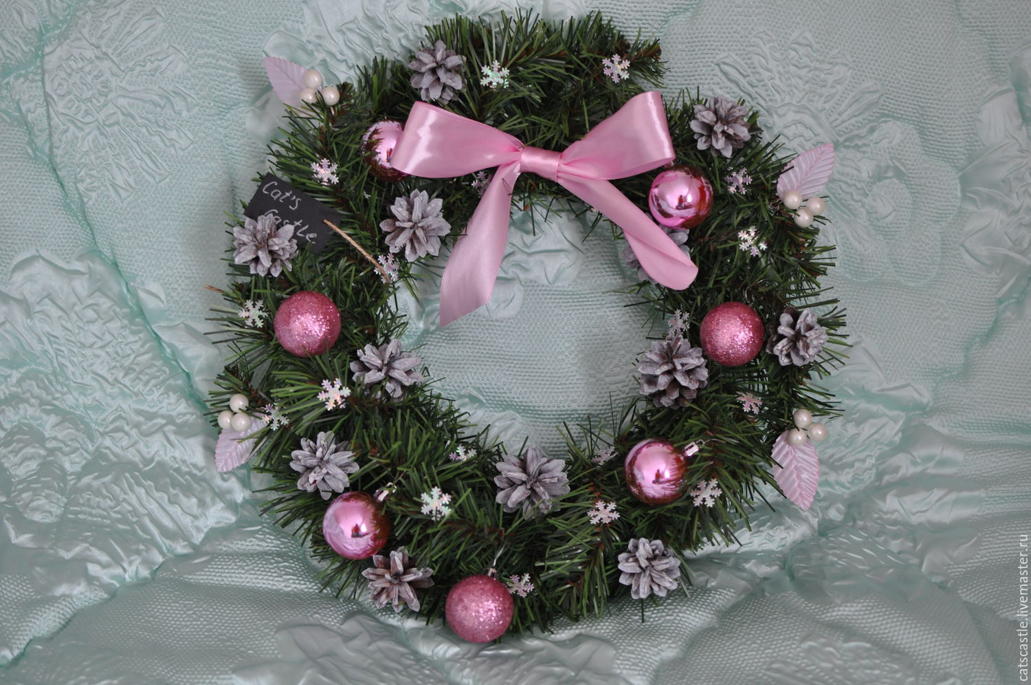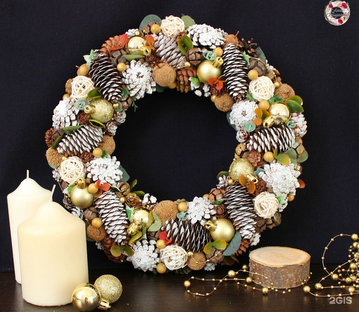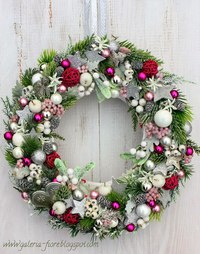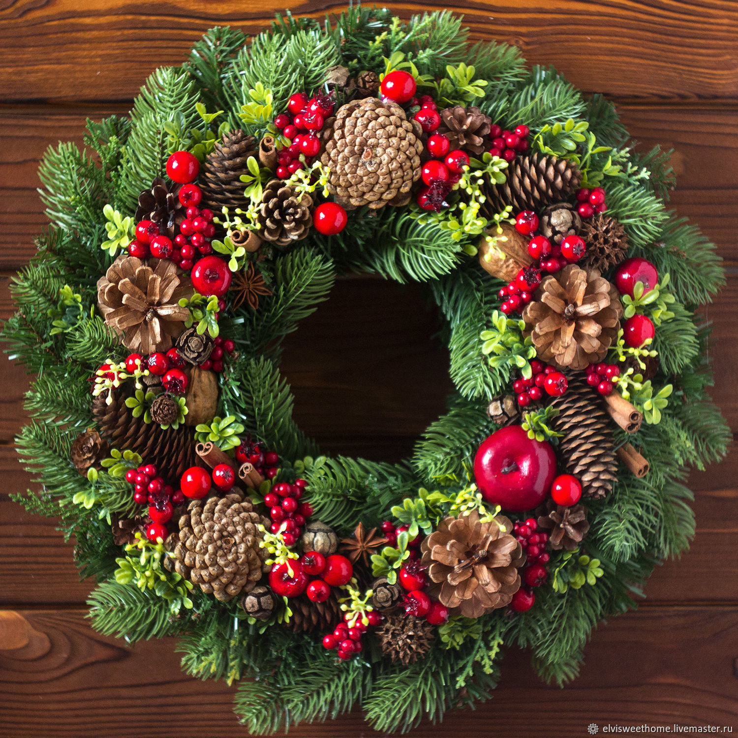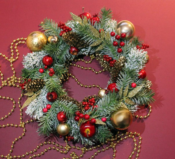 Венок больше осенний 🙂 Но если добавить несколько ёлочных игрушек-шаров, будет интересно. Пофантазируйте! 😉
