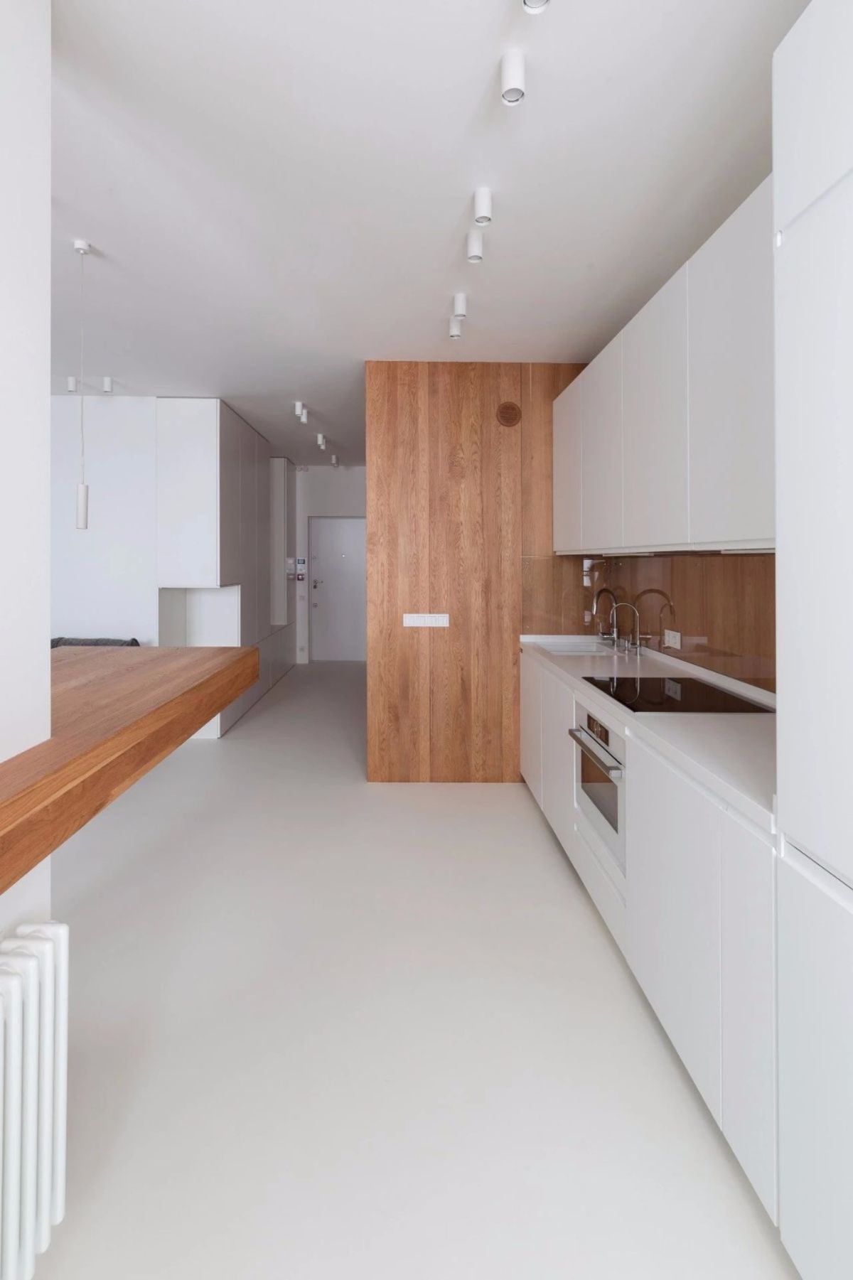 Поскольку дерево — достаточно активный материал по цвету и фактуре, остальное пространство выполнено в мягких тонах: белые стены, белые полы, белые кухонные шкафы, потолок оставлен бетонный. С таким объемом дерева, который парит среди белых стен, белого пола и бетонного потолка ».