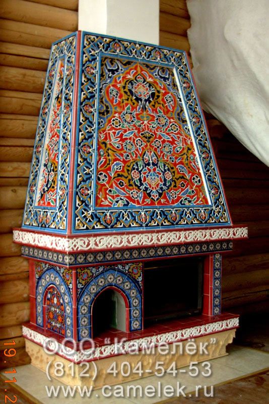 Это древний способ украшения печи. Изразцы изготавливаются из огнеупорной глины. Они имеют лицевую часть, покрытую глазурью, и глиняную коробку, посредством которой их прикрепляют к поверхности печки.