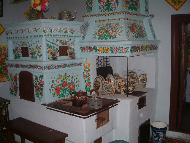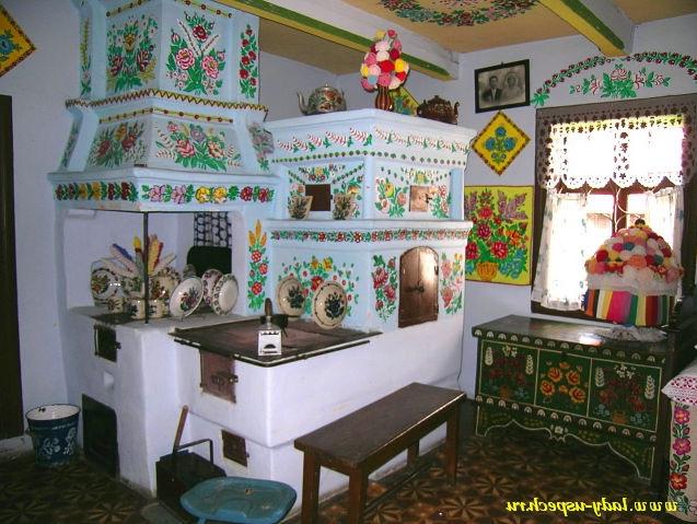 Еще один способ украшения печки в кухне из подручных материалов – с использованием фасадной краски и глиняного раствора. Можно нарисовать на стенах печи домик с подсолнухами. Соответствующие рисунки можно выполнить на стенах и потолке кухни. На потолок в кухне прикручивают расписанный лист фанеры и встраивают в него светильники. Можно выполнить скульптуру сидящего на печке кота.