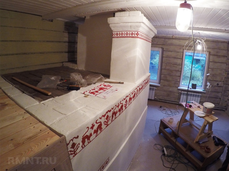 Новую печку штукатурят глиняным раствором или составом, приготовленным из готовой жаропрочной сухой смеси, которых рынок предлагает немалый ассортимент. В случае, если отделываться будет старая печь, готовят поверхность стандартно — зачищают до прочной основы, удаляют все слабые участки старой штукатурки и заделывают их жаропрочным раствором. Затем печь нужно хорошо просушить.