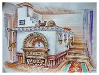… последняя комната — реконструкция интерьера традиционного вепсского дома. На ней изображен стол, окруженный деревянными скамьями, Юмальчога для религиозных икон (рис. 2.3), кровать и русская печь. …