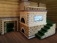 Фото 3. Русская печка, украшенная изразцами. К лежанке ведёт небольшая деревянная лесенка.