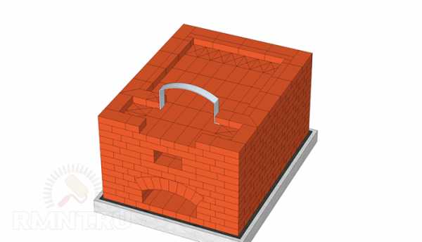 Тринадцатый ряд закладывает варочную камеру и шесток. Здесь же устанавливается дуга устья из закаленного металла. Прикрепленная к ней закаленная стальная проволока закладывается в кладку.