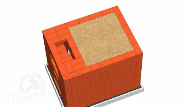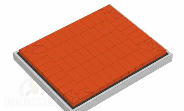 Первый ряд укладывается на гидроизоляцию фундамента. В углах применяются кирпичи размером в 3/4 и скошенные кирпичи для лучшей перевязки последующих рядов кладки. Вся конструкция опечья выкладывается на цементно-песчаном растворе.