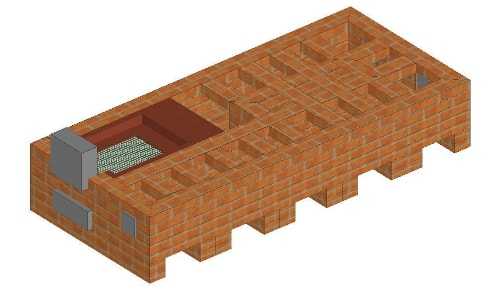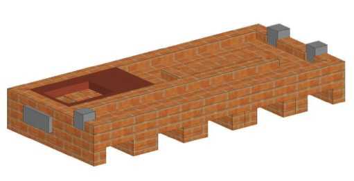 - Здесь дают старт кладке топки. По этой причине камеру усиливают футеровкой – на иллюстрации её видно по отличающемуся оттенку. Стартует устройство каналов. Монтируют 3 дверки для очистных камер. Поддувальную заслонку полностью перекрывают кирпичом.