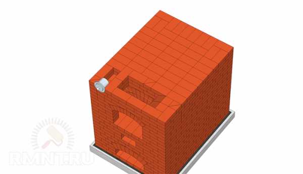 Далее кладка идет в зависимости от высоты комнаты: снаружи дымоход будет сужаться ступенькой перед потолком, и далее будет формироваться труба, которая будет проходить через перекрытие и кровлю. На этом и заканчивается строительство русской печи своими руками.