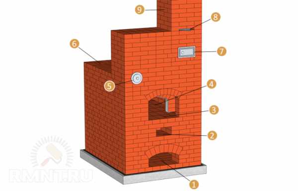 Русская печь своими руками: чертежи и порядовка 1 — подпечье; 2 — подшесток; 3 — шесток; 4 — под; 5 — душник; 6 — перекрыша; 7 — полудверка; 8 — задвижка; 9 — труба дымохода