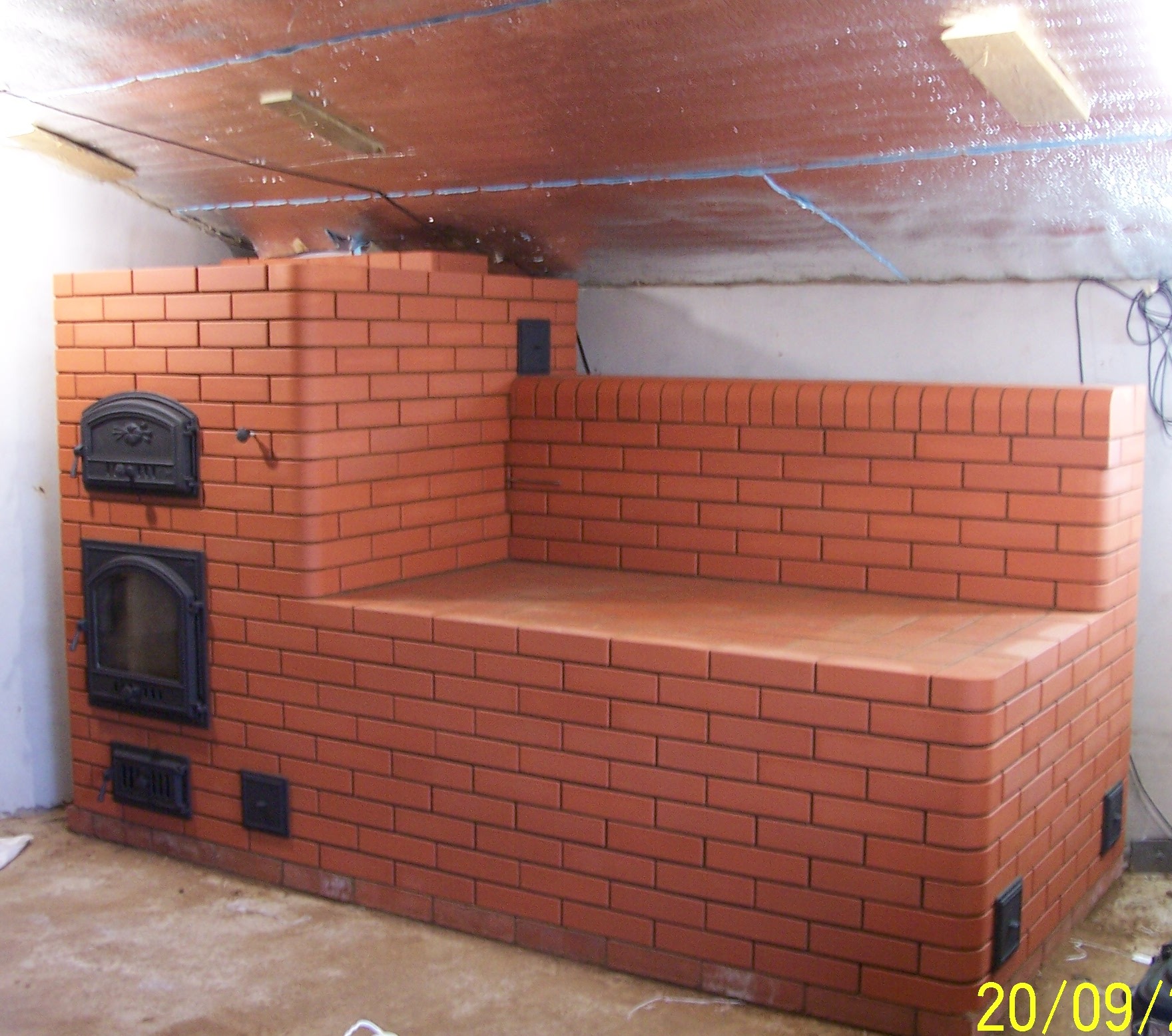 ПостройкаПо размерам русская печь многим покажется очень большой. Она объёмнее не только «голландок» или «шведок», но и «комбайнов», совмещающих в себе печь с камином. Кроме того, топка русской печи расположена высоко (около 80 см от пола) и нижняя часть печи (подпечье) не прогревается. Возникают у современных застройщиков к русской печи и другие «претензии». Но есть и рьяные защитники русской печи. Они полагают, что за возможность полежать на тёплой печи, погреть косточки можно пожертвовать лишней охапкой дров, которых в России пока хватает. Или, что каша и щи, приготовленные в печи, не идут ни в какое сравнение с тем, что можно приготовить на газовой или электрической плите. А уж про пироги из русской печи, про топлёное молоко и тому подобные радости жизни — о них защитники традиционных устоев могут говорить часами. А для более эффективного обогрева помещения к русской печи можно пристроить подтопок. К тому же и усовершенствованных типов печи известно много. Например, ещё в 1927 г. Наркомзем СССР объявлял Всесоюзный конкурс на проект русской печи улучшенной конструкции. Кроме того, уже в те времена подвергалось сомнению и утверждение о малой эффективности русской печи. Чтобы выяснить фактический её кпд, в 20-е годы XX века были проведены специальные испытания. Результаты оказались интересными — даже традиционная русская печь согласно новым расчётам имеет кпд, равный 68%. А у печи с нижним прогревом эффективность использования топлива достигает 80%! Эти доводы привели в последнее время к тому, что людей, готовых строить в своих загородных домах русские печи, становится всё больше. И русская печь постепенно занимает своё, пусть и скромное место в ряду «шведок», «голландок», каминов и современных печей промышленного производства. Свою печь мы хотели построить максимально традиционной. Основной материал — рядовой полнотелый кирпич марки 100 под штукатурку. Правда, топки обложены шамотным кирпичом Ш-8, а свод сделан из шамотного клиновидного кирпича марки Ш-47, чего раньше, конечно же, не делали.