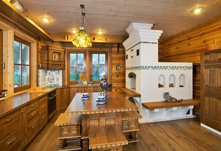 Дизайн дома в этом стиле выглядит намного богаче. Печь можно оформить изразцами, дополнить кухонным гарнитуром из дерева в классической манере, пол выложить керамической плиткой, в столовой или гостиной можно установить большой дубовый стол, резные стулья, сервант с красивой керамической посудой.