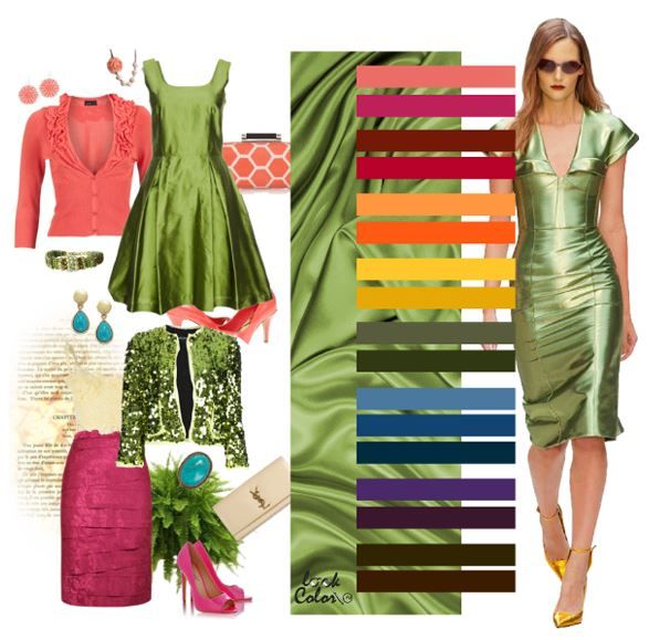 - Розовый + оливковый = очень необычное и яркое сочетание. Подойдет для весенних и летних образов. Яркие акценты розового, (можно выбрать оттенок даже ближе к малиновому), очень разбавят зеленый цвет.