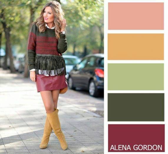 Дорогой образ можно получить с помощью дуэта оливы и бордо. Платье или костюм насыщенного и благородного бордового в комплекте с пальто глубокого оливкового цвета подойдёт для романтических ужинов и встреч.