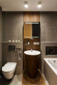 Это – минимальное наполнение ванной комнаты, совмещенной с туалетом. Ванна или душевая, а также стиральная машинка занимают много места, они должны быть привязаны к инженерным коммуникациям – подводу воды, канализации.