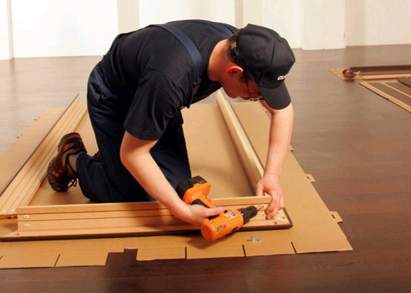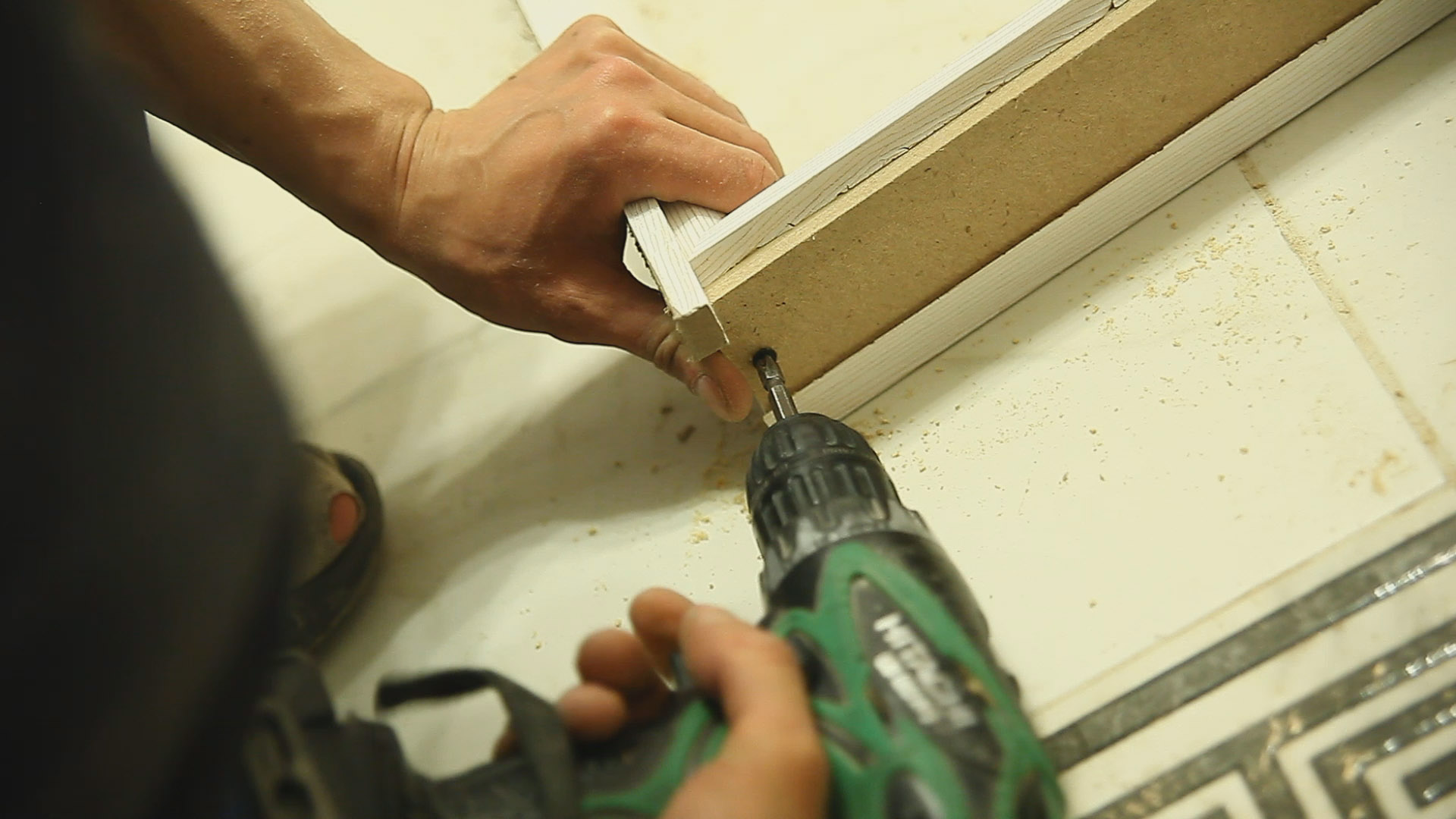 - Как только все составляющие запилены, нужно переходить к сборке частей. Работать легче, положив их на пол. Для безопасности, сверло лучше использовать небольшого диаметра. Саморезы обязательно должны быть для дерева, прикручиваются они также под углом 45 градусов. Во время скрепления частей их надо плотно прижимать друг к другу, так как саморезы растягивают детали.