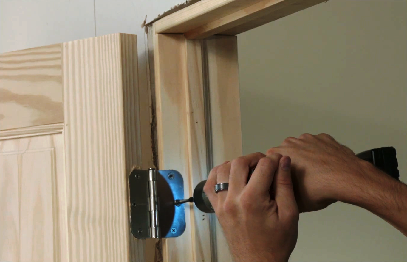 - Когда конструкция будет плотно закреплена в проеме, можно приступать к подготовке двери к подвесу. В первую очередь, к ней прикручиваются петли, а вторая их часть закрепляется на петельном брусе. Главное — не ошибиться с высотой, так как дверь будет расположена не ровно. Если все сделано правильно, после того, как вы навесите полотно, будут соблюдены все зазоры.