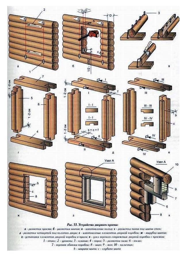 Эти две части устанавливаются по одинаковому принципу. Для начала определимся с длиной этих составляющих. Длина будет включать в себя ширину дверного проема, зазоров с обеих сторон по 3 мм, толщины профильного бруса вертикальных стоек. Для установки в заготовке под порог и перемычку делаются выборки – срезают часть выступающей лутки (в нее упирается дверь при закрывании). По ширине срез составляет максимальную ширину стойки. Пропилы выполняются пилой с мелкими зубьями (откладываются от края заготовки). Детали устанавливают вертикально, лишнюю часть скалывают. Собранную коробку необходимо свинтить.