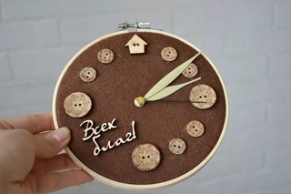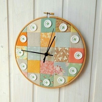 Рукодельницам не составит большого труда сделать основу для часов из ткани, натянутой на пяльцы для вышивания, дополнить её аппликацией, пёстрыми пуговицами или разноцветными лоскутками.