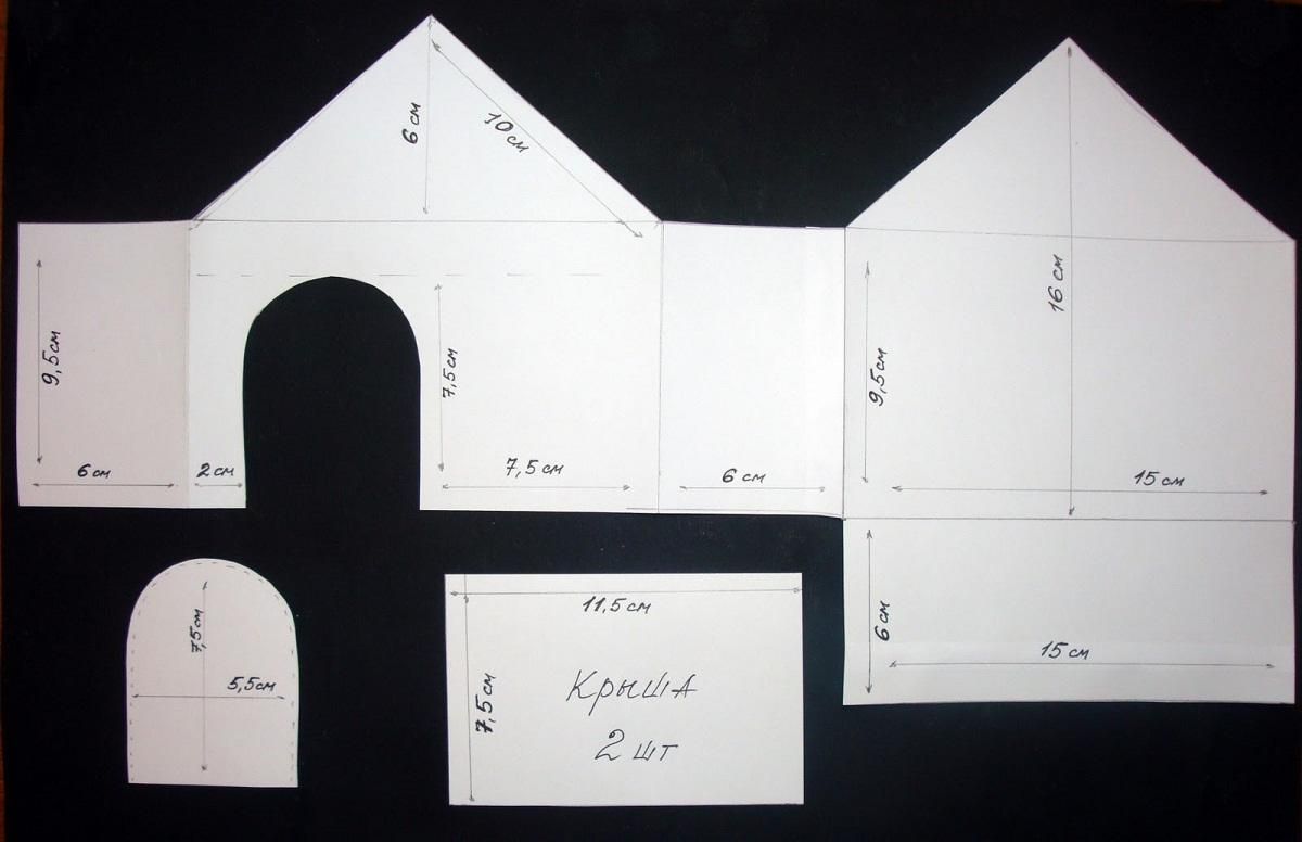 Далее переводим силуэт домика на лист картона, вырезаем передний и задний фасады.