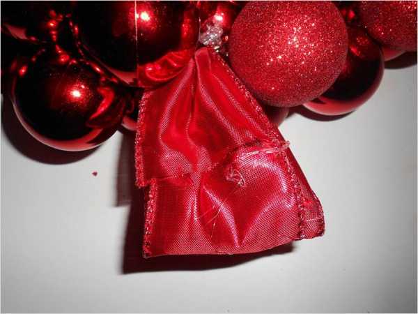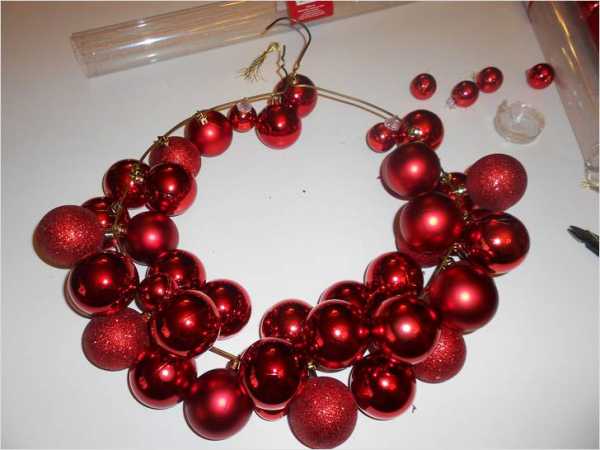 Елочный шары. Прекрасно смотрится венок из елочных шаров. Шары приклеивают к основанию друг к другу клеевым пистолетом. Использовать можно большие и маленькие шары разных цветов или близких друг к другу.