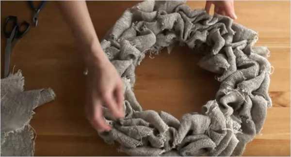 Атласные ленты. Не одна, как в классическим варианте, а много. С их помощью можно сделать очень нарядный венок. Нарежьте ленты на одинаковые отрезки, сложите пополам и по очереди приклеивайте их внахлест друг к другу на основу. В завершении украсьте венок льняным бантом и капните на него каплю цитрусового масла. Аромат будет волшебным.
