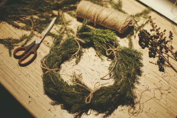 Чтобы сделать красивый венок, необходимо смастерить каркас и нарезать хвойные ветви подходящей длины. Затем нужно начать сплетать ветки между собой по направлению часовой стрелки.
