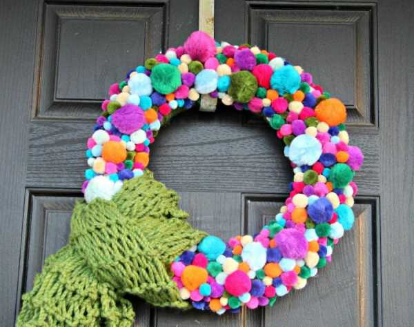 Шерстяные нитки. Декор венка шерстяными нитками не требует хвойного плетения. Вы просто берете основу (идеально – пенопластовое кольцо) и обматываете ее плотными цветными нитками, можно в несколько слоев. Дополнительно декорировать венок можно елочными шарами, фетровыми фигурками зверей, птиц, растений. Чтобы придать венку приятный аромат, привяжите к нему холщовый мешочек, насыпав в него ароматную траву (лаванда вполне подойдет).