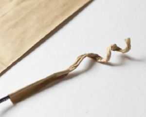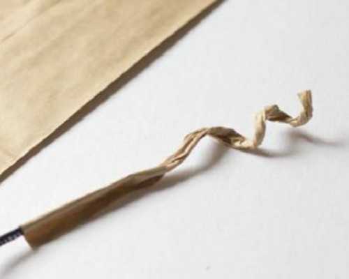 - На нее мы наворачиваем крафт бумагу и затем закручиваем в хвостик: наматываем на карандаш.