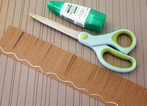 6. На второй такой же полоске делаем с одной стороны бахрому, а с другой — наносим клей и скручиваем вокруг уже готового ствола.