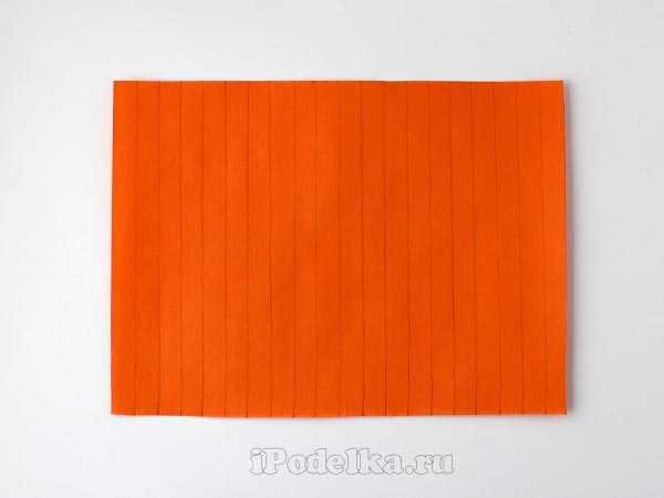 Начертить полоски на листе оранжевого листа. Ширина и длина полосочек зависит от размера тыквы, какую вы хотите сделать.