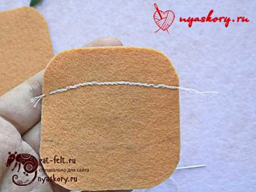 - Складываем заготовки в стопку. Чтобы они не разъезжались, используем канцелярский зажим. Отступаем от края около 0,5 см и вводим иглу с нитью. Выводим на противоположную сторону, завязываем узел, но не отрезаем нить.