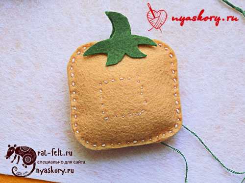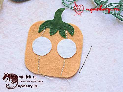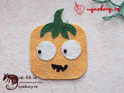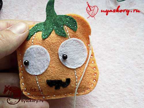 - Остатком нити прошиваем отрезок шнура. Должна получиться петля, за которую будет удобно подвешивать тыкву.