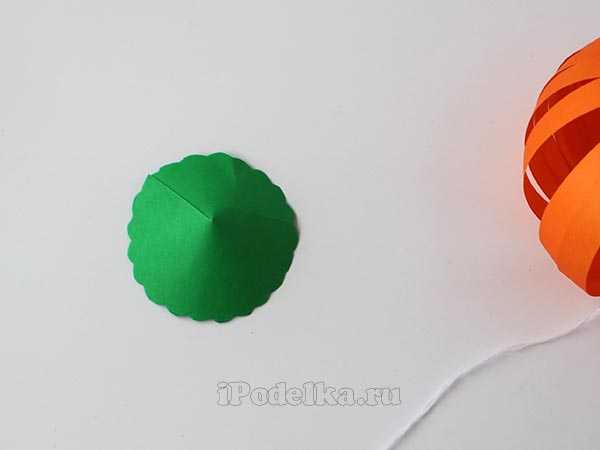- Из бумаги зеленого цвета вырезаем листок круглой формы и наклеиваем на верхнюю часть поделки.