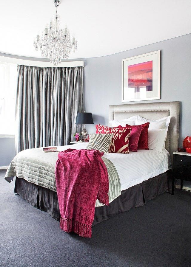 Сочетая этот тон с другими оттенками из той же семьи, вы действительно сможете смешать цветовую гамму и сохранить тепло в интерьере. Здесь выбор темно-бордовой краски обеспечивает отличный фон для светлых красных пятен, которые выходят на первый план в виде лампы и акцентируют мягкую мебель на кровати.