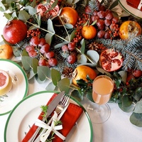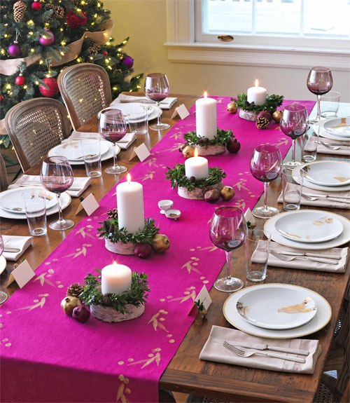 Еловые ветви можно просто положить у тарелочки каждого гостя или выложить в длинную линию по центру, а также сделать из них веночек или сложить на прямоугольном блюде в центре стола, не забыв дополнить композицию свечами.