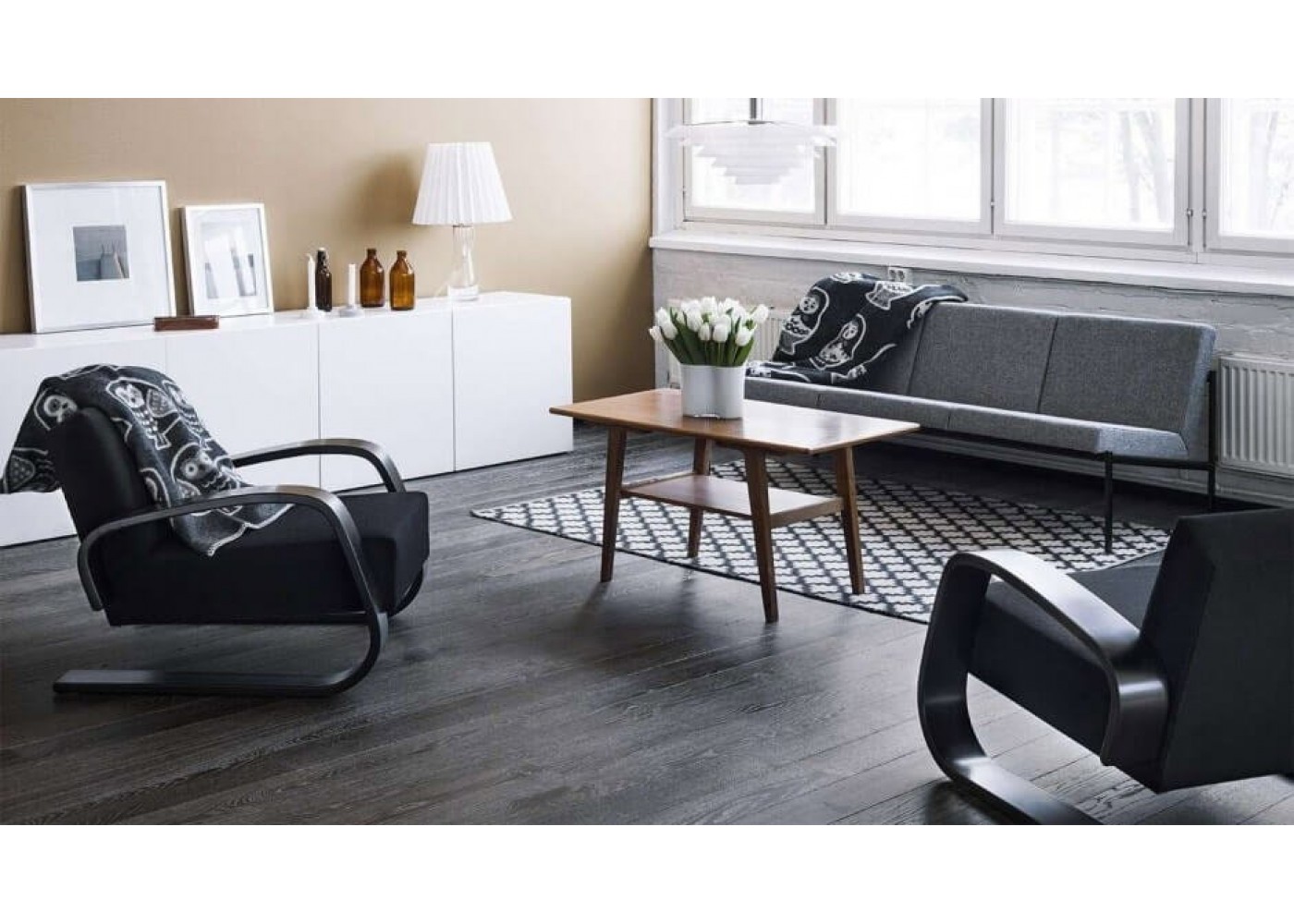 Серый ламинат неплохо смотрится и в интерьерах, выполненных в этнических стилях северных народов, например, скандинавов