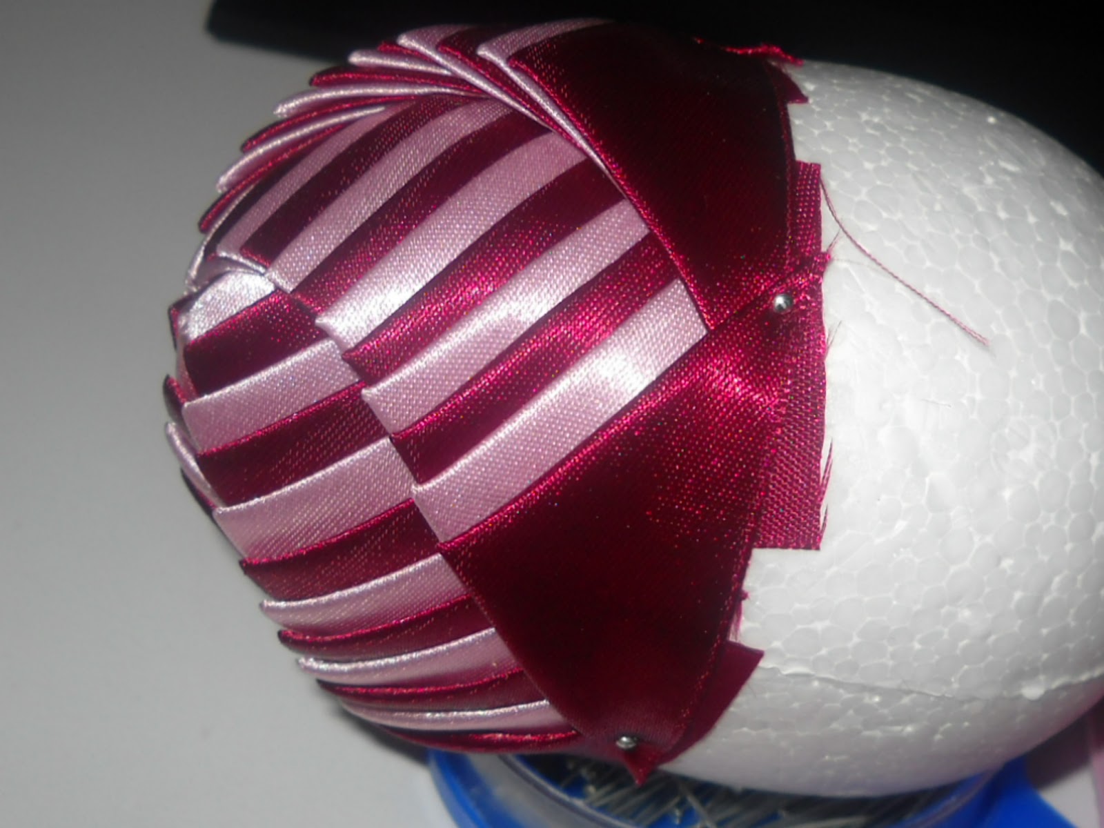 У меня было две ленты разного размера, поэтому для больших лент я использовал две булавки на обоих концах перекрывающейся части обернутой ленты.Для лент меньшего размера я использовал только одну булавку в середине перекрывающейся части обернутой ленты. Когда топиарий был достаточно заполнен, я начала использовать одну булавку для больших лент, так их было легче сжимать.