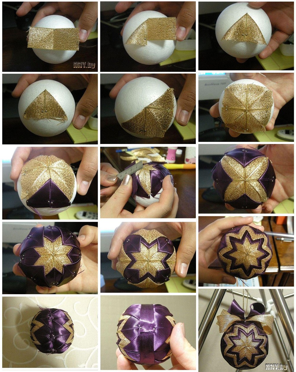 Если вы усидчивы и терпеливы, то попробуйте порезать ткань на кусочки и с помощью иголок сделать шикарные новогодние шары из лент своими руками по пошаговым фото ниже.
