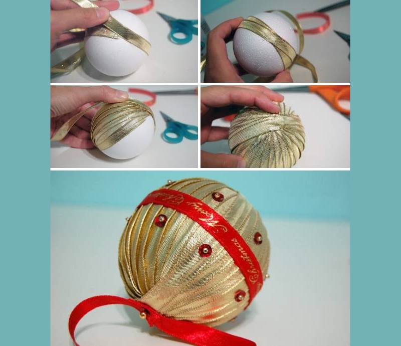Чтобы не тратить много времени и сил, вы можете обмотать узкой лентой обычный старый шар и украсить его бусинами, пайетками, тесемками или кружевом. Метод похож на украшение шаров нитками, только результат получится более роскошный. Смотрите новогодние шары из лент на следующих фото: