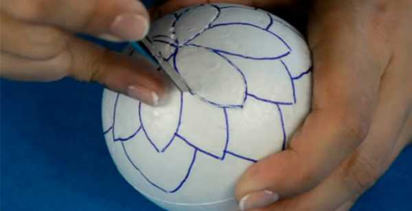 - Из монтажной пены или пенопласта. Застывшая монтажная пена сходна по текстуре с пенополистиролом, такая же легкая и удобная для обработки. Для начала нужно вырезать острым ножом кубики, размер которых должен быть чуть больше желаемого диаметра. Далее следует срезать углы тонкими слоями. Окончательное выравнивание лучше всего сделать с помощью крупнозернистой наждачной бумаги. Потихоньку обтачивая неровности и углы, максимально постараться приблизить её к форме. Даже если останутся какие-то перекосы, не нужно расстраиваться, ведь ручной труд тем и отличается от машинного, что невозможно создать идеально ровную поверхность. Да и любое несовершенство лишь подтвердит неповторимость.