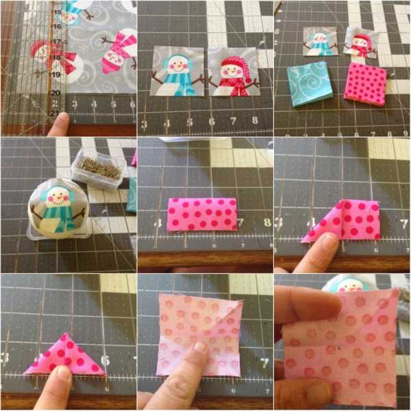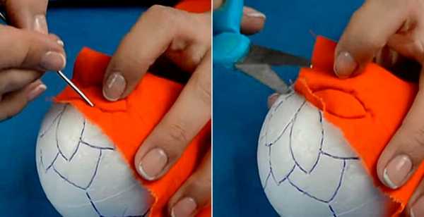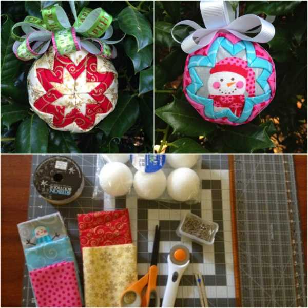 Хотите сделать оригинальный новогодний шар своими руками, тогда обратите внимание на шар из лоскутов. Для этого Вам понадобится: пенопластовый шар, канцелярский нож, ткань разных цветов, фломастер, рулетка, клей, английские булавки, деревянная шпажка или зубочистка.