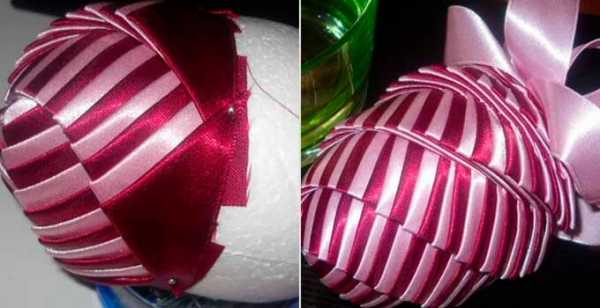 Пример украшения поделки бусинами, пайетками и атласными лентами.