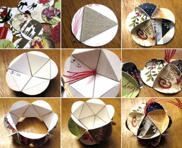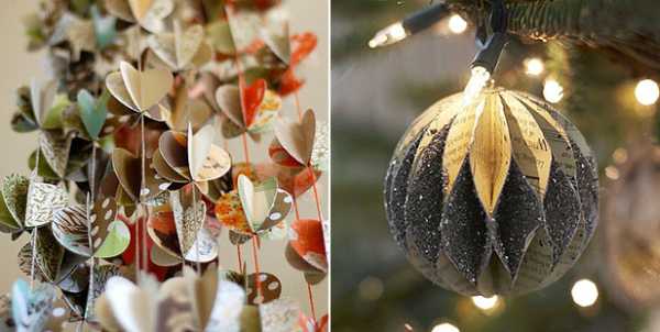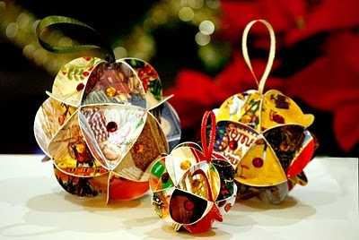 Из старых открыток или цветной бумаги можно сделать вот такие симпатичные елочные игрушки — новогодние шары.