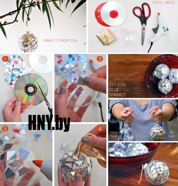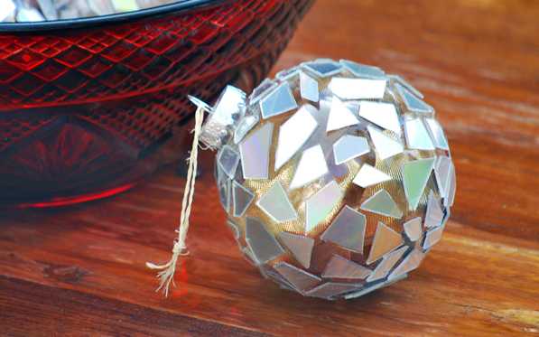 Для изготовления такого шара Вам понадобится: простой стеклянный или пластмассовый шар, старые компакт-диски, ножницы, лента, клей.